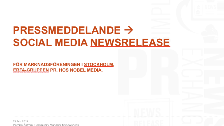Fem utmaningar för kommunikatören i att förvandla ett traditionellt pressmeddelande till en lyckad social media newsrelease. Presentation av Pernilla Åström från Mynewsdesk hos Marknadsföreningens pr-erfagrupp.
