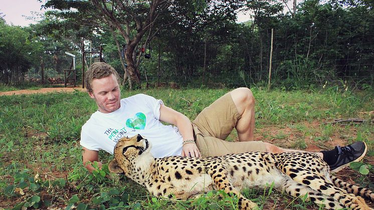 Foto: Föreställer Daniel Wilke, anställd på Mynewsdesk, tillsammans med en räddad gepard.