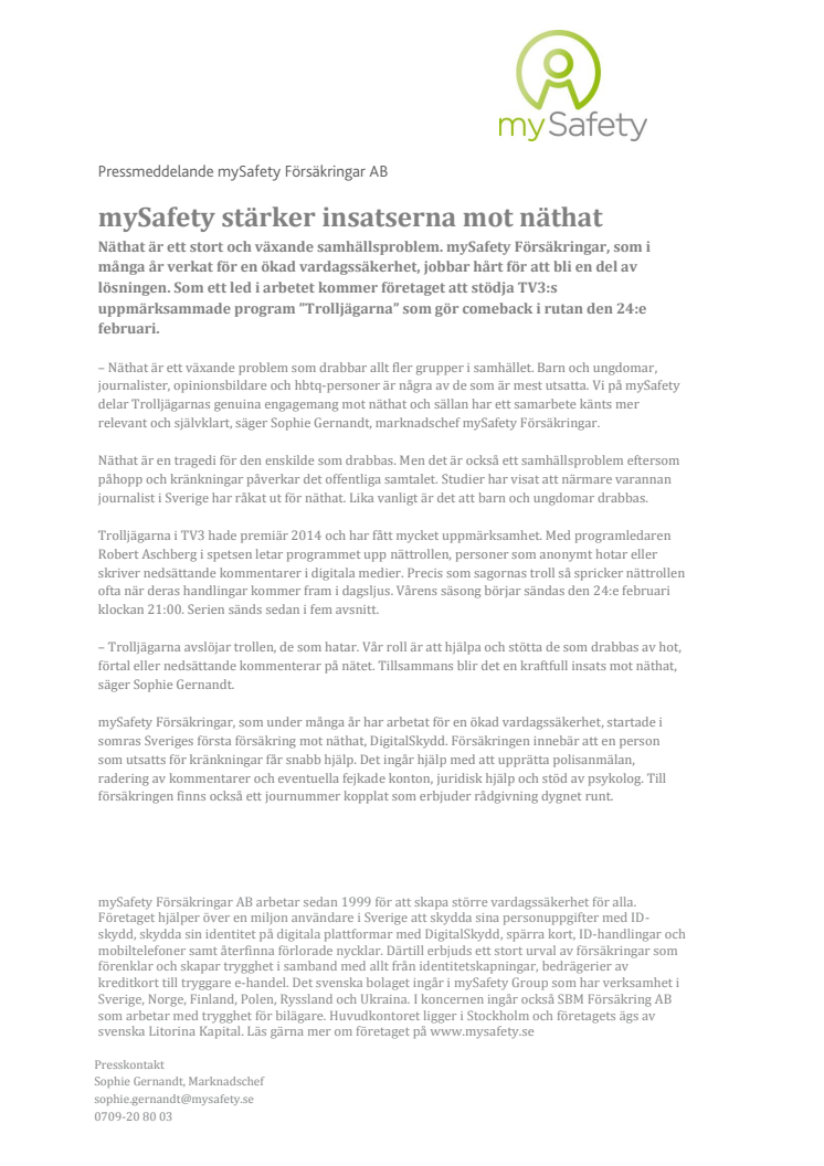 Näthat är ett stort och växande samhällsproblem. mySafety Försäkringar, som i många år verkat för en ökad vardagssäkerhet, jobbar hårt för att bli en del av lösningen. Som ett led i arbetet kommer företaget att stödja TV3:s uppmärksammade program ”Trolljägarna” som gör comeback i rutan den 24:e februari.