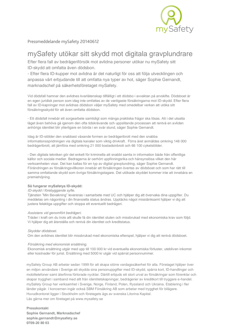 - Efter flera ID-kupper mot avlidna är det naturligt för oss att följa utvecklingen och anpassa vårt erbjudande till att omfatta nya typer av hot, säger Sophie Gernandt, marknadschef på säkerhetsföretaget mySafety.
