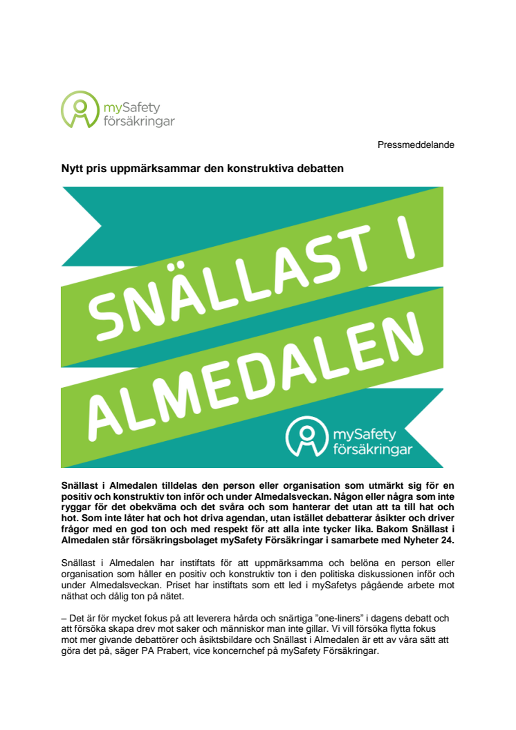 Snällast i Almedalen tilldelas den som utmärkt sig för en positiv och konstruktiv ton inför och under Almedalsveckan. Den som inte ryggar för det obekväma och det svåra och som hanterar det utan att ta till hat och hot. Den som debatterar åsikter och driver frågor med en god ton och med respekt för att alla inte tycker lika. Bakom Snällast i Almedalen står försäkringsbolaget mySafety Försäkringar.