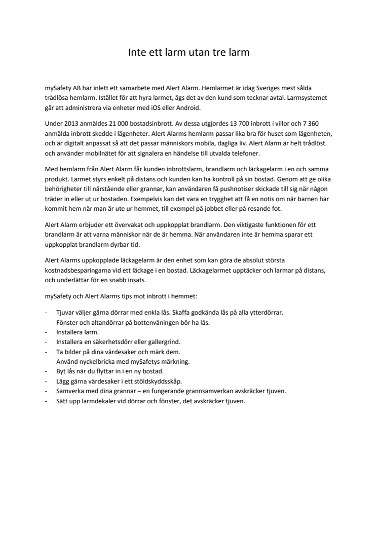mySafety AB har inlett ett samarbete med Alert Alarm. Hemlarmet är idag Sveriges mest sålda trådlösa hemlarm. Istället för att hyra larmet, ägs det av den kund som tecknar avtal. Larmsystemet går att administrera via enheter med iOS eller Android, till exempel smarta telefoner.