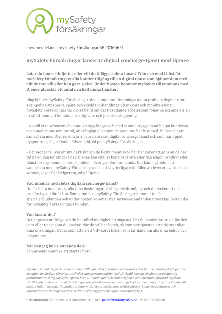 - Det moderna livet är ofta hektiskt och de flesta människor har fler saker att göra än de har tid på en dag för att göra det. Djenee kan istället köpa, leverera eller fixa någon produkt eller tjänst för dig, hemma eller på jobbet. I Sverige eller utomlands. Det känns jättekul att samarbeta med mySafety Försäkringar och att få ytterligare tillfällen att leverera världsklass-service, säger Pär Helgosson, vd på Djenee.