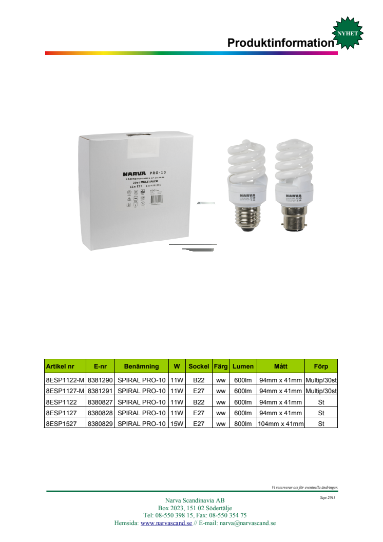 Liten energieffektiv lampa som ger bra ljus (600lm), tänder snabbt och klarar över 20 000 tändningar (50 tändningar/dag=livslängd ca: 400 dagar). Byggförpackningen innehåller 30st 11W lågenergilampor med E27 eller B22 sockel. Lampans smarta egenskaper och förpackningens konstruktion gör att den passar perfekt för bygg och fastighets branschen. Produkten finns hos välsorterade elgrossister.
