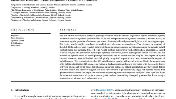 Azurmesar, blåmesar och ett 20-tal individer som klassades som hybrider, från både Naturhistoriska riksmuseets och andra museers samlingar, ingick studien där deras genom analyserades. Resultaten visar att det är svårt att avgöra en fågels hybridinnehåll enbart genom att titta på utseendet. Individer som bedömts som rena azurmesar kunde uppvisa liknande hybridinnehåll som individer med smärre dräktavvikelser.