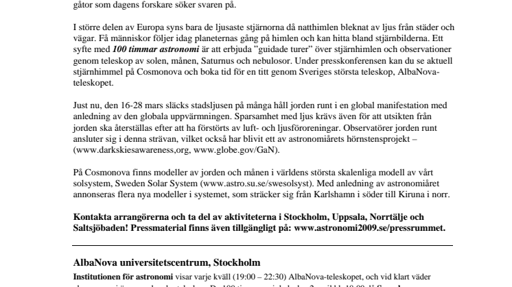 I större delen av Europa syns bara de ljusaste stjärnorna då natthimlen bleknat av ljus från städer och vägar. Få människor följer idag planeternas gång på himlen och kan hitta bland stjärnbilderna. Ett syfte med 100 timmar astronomi är att erbjuda "guidade turer" över stjärnhimlen och observationer genom teleskop av solen, månen, Saturnus och nebulosor. Under presskonferensen kan du se aktuell stjärnhimmel på Cosmonova och boka tid för en titt genom Sveriges största teleskop, AlbaNova-teleskopet.