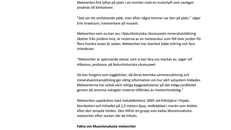 Meteoriten som nu kan ses i Naturhistoriska riksmuseets mineralutställning Skatter från jordens inre, är resterna av en meteorskur som föll över jorden för flera hundra tusen år sedan. Meteoriten har överlevt både vittring och fyra inlandsisar.