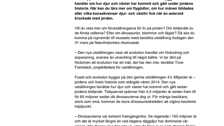 Äntligen är det nypremiär för Naturhistoriska riksmuseets mest populära utställning – den med dinosaurierna. Tisdagen den 31 mars 2015 öppnar Fossil och evolution efter ett års ombyggnad. Den handlar om hur djur och växter har kommit och gått under jordens historia. Här kan du lära mer om flygödlor, om hur månen bildades eller vilka konsekvenser djur- och växtliv fick när en asteroid krockade med jorden.