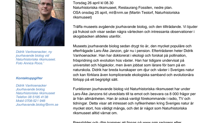 Museets jourhavande biolog sedan drygt tio år, den mycket populäre och efterfrågade Lars-Åke Janzon, går nu i pension. Efterträdaren heter Didrik Vanhoenacker. Han har doktorerat i ekologi och forskat på pollination, fröspridning och evolution hos växter. Han har tidigare undervisat på universitet och högskolor, men även jobbat som lärare för barn på en naturskola. Didrik har breda kunskaper om djur och växter i Sveriges natur och kan förklara även komplicerade ekologiska samband och evolutionära förlopp på ett begripligt sätt.