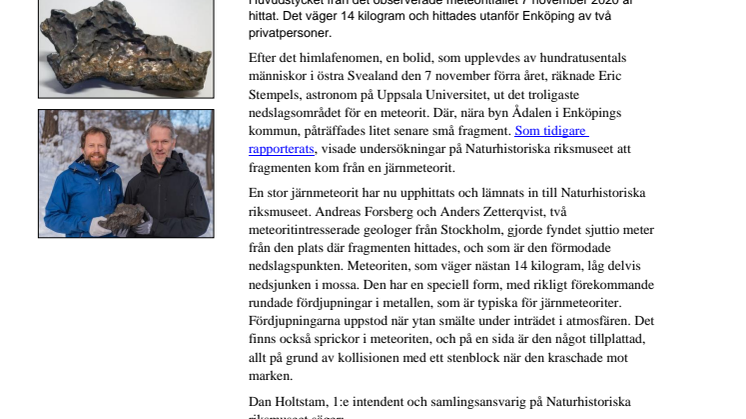 Huvudstycket från det observerade meteoritfallet 7 november 2020 är hittat. Det väger 14 kilogram och hittades utanför Enköping av två privatpersoner.