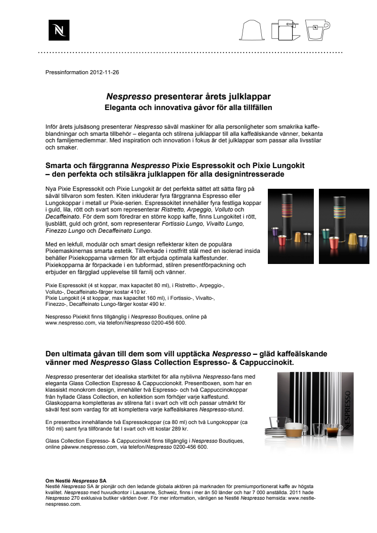 Inför årets julsäsong presenterar Nespresso såväl maskiner för alla personligheter som smakrika kaffe-blandningar och smarta tillbehör – eleganta och stilrena julklappar till alla kaffeälskande vänner, bekanta och familjemedlemmar. Med inspiration och innovation i fokus är det julklappar som passar alla livsstilar och smaker.