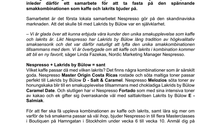 För att fler ska få uppleva kombinationen av kaffe och lakrits, samt lära sig mer om varför de två smakerna passar så väl ihop, bjuder Nespresso in till flera Masterclasses i Boutiquen på Hamngatan i Stockholm under vecka 6 till vecka 10. Anmäl dig på länken här: https://www.nespresso.com/se/en/events#/