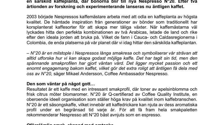 – N°20 är en milstople i Nespressos långa smakresa och symboliserar vår strävan att alltid utforska hur vi kan skapa godast möjliga kaffe. Det har tagit sin tid, men den spännande smakprofilen har gjort väntan värd. Det ligger mycket passion och ett enormt engagemang bakom kaffet, vilket gör det extra roligt att äntligen få dela med oss av N°20, säger Mikael Andersson, Coffee Ambassador Nespresso.