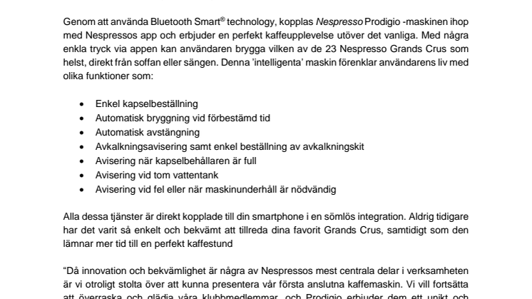 Genom att använda Bluetooth Smart® technology, kopplas Nespresso Prodigio -maskinen ihop med Nespressos app och erbjuder en perfekt kaffeupplevelse utöver det vanliga. Med några enkla tryck via appen kan användaren brygga vilken av de 23 Nespresso Grands Crus som helst, direkt från soffan eller sängen. Denna ’intelligenta’ maskin förenklar användarens liv med olika funktioner som: