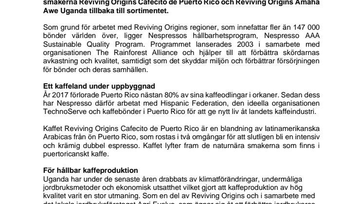 Sedan 2019 har Nespressos initiativ Reviving Origin stöttat kaffeproduktionen i länder där det finns försvårande omständigheter. Inom serien har flertalet säsongskaffen varit på besök genom åren. Nu välkomnar Nespresso de populära smakerna Reviving Origins Cafecito de Puerto Rico och Reviving Origins Amaha Awe Uganda tillbaka till sortimentet.