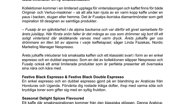 – Fusalp är en självklarhet i de alpina backarna och var därför ett givet samarbete för årets julsläpp. När första snön faller är det många av oss som drömmer sig bort till ett soligt vinterland där skidåkande varvas med varm dryck. Årets julkaffe ger oss drömmare en liten bit av alperna i varje kaffekapsel, säger Linda Fazekas, Nordic Marketing Manager Nespresso.