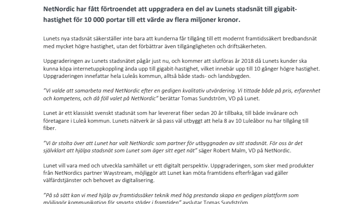 Uppgraderingen av Lunets stadsnätet pågår just nu, och kommer att slutföras år 2018 då Lunets kunder ska kunna köpa internetuppkoppling ända upp till gigabit-hastighet, vilket innebär upp till 10 gånger högre hastighet. Uppgraderingen innefattar hela Luleås kommun, alltså både stads- och landsbygden.