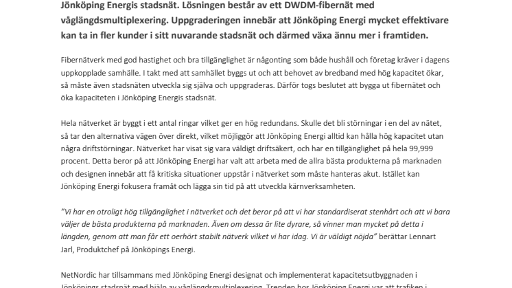 NetNordic har fått förtroendet att bygga ut och uppgradera fiberinfrastrukturen i Jönköping Energis stadsnät. Lösningen består av ett DWDM-fibernät med våglängdsmultiplexering. Uppgraderingen innebär att Jönköping Energi mycket effektivare kan ta in fler kunder i sitt nuvarande stadsnät och därmed växa ännu mer i framtiden.