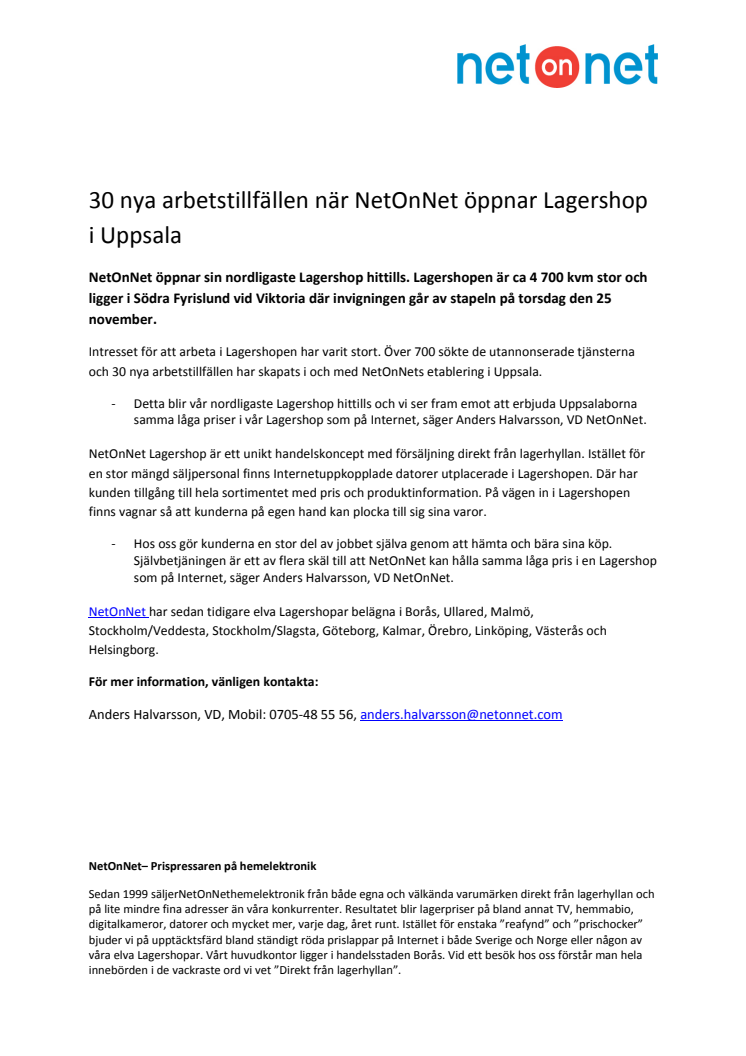 NetOnNet öppnar sin nordligaste Lagershop hittills. Lagershopen är ca 4 700 kvm stor och ligger i Södra Fyrislund vid Viktoria där invigningen går av stapeln på torsdag den 25 november.
