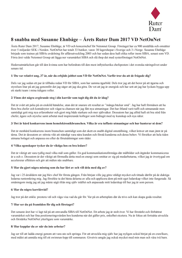 Ruter Dam har ställt 8 snabba frågor till Årets Ruter Dam, Susanne Ehnbåge från NetOnNet och sammanställt dem tillsammans med hennes svar.