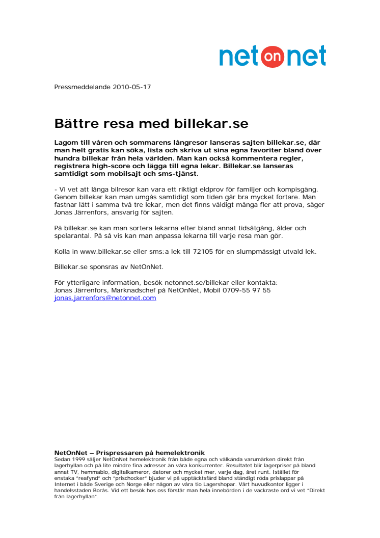 Lagom till våren och sommarens långresor lanseras sajten billekar.se, där man helt gratis kan söka, lista och skriva ut sina egna favoriter bland över hundra billekar från hela världen. Man kan också kommentera regler, registrera high-score och lägga till egna lekar. Billekar.se lanseras samtidigt som mobilsajt och sms-tjänst.