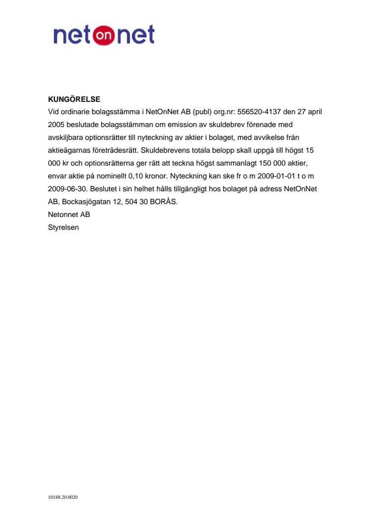 Vid ordinarie bolagsstämma i NetOnNet AB (publ) org.nr: 556520-4137 den 27 april 2005 beslutade bolagsstämman om emission av skuldebrev förenade med avskiljbara optionsrätter till nyteckning av aktier i bolaget, med avvikelse från aktieägarnas företrädesrätt.
