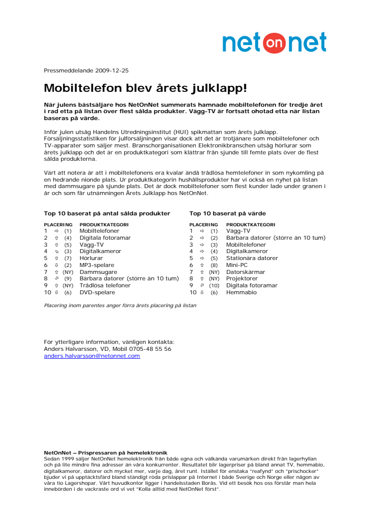 När julens bästsäljare hos NetOnNet summerats hamnade mobiltelefonen för tredje året i rad etta på listan över flest sålda produkter. Vägg-TV är fortsatt ohotad etta när listan baseras på värde.