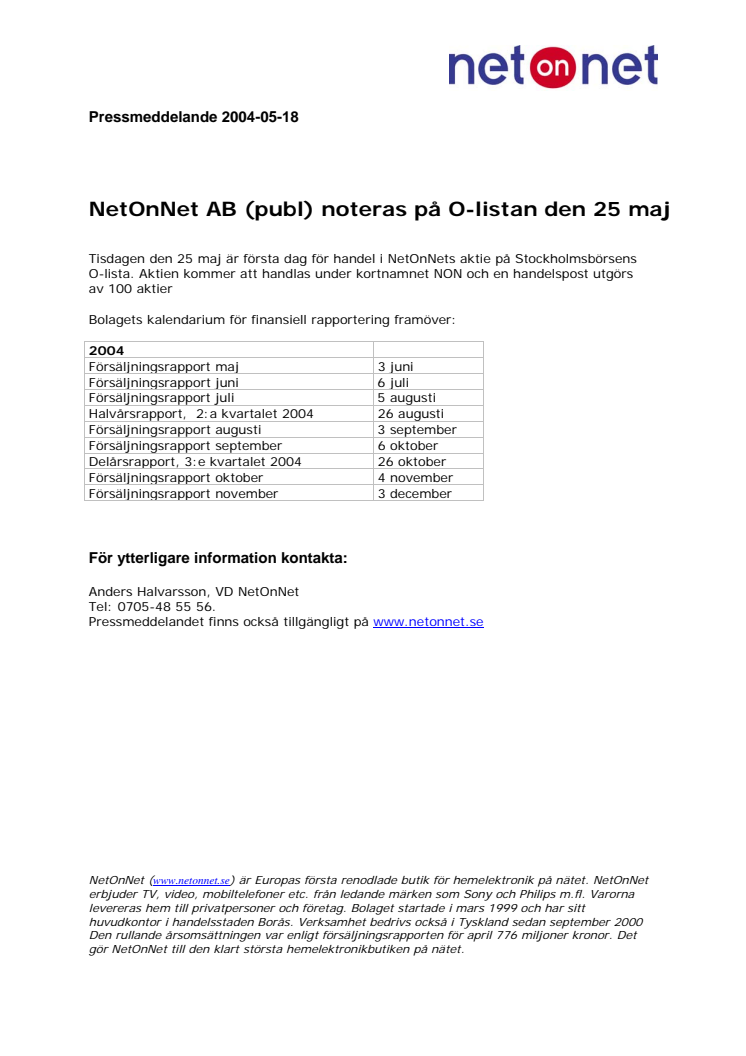 Tisdagen den 25 maj är första dag för handel i NetOnNets aktie på Stockholmsbörsens O-lista. Aktien kommer att handlas under kortnamnet NON och en handelspost utgörs av 100 aktier
