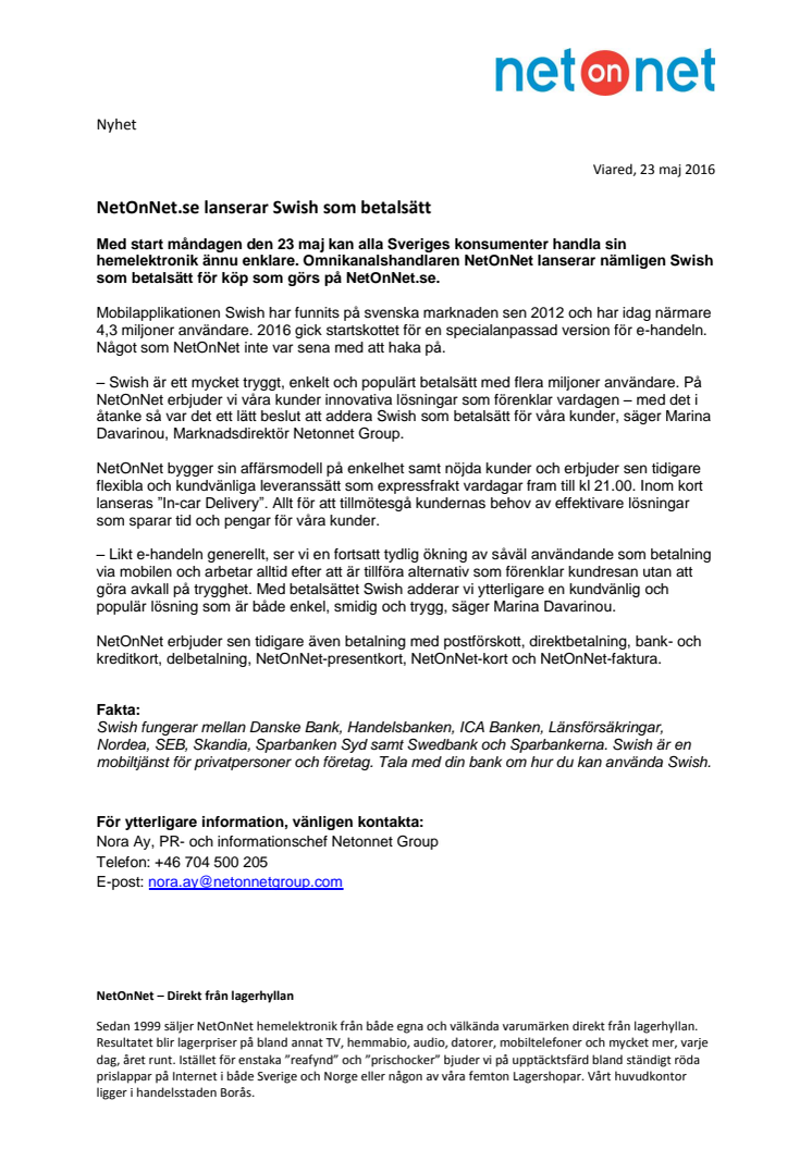Med start måndagen den 23 maj kan alla Sveriges konsumenter handla sin hemelektronik ännu enklare. Omnikanalshandlaren NetOnNet lanserar nämligen Swish som betalsätt för köp som görs på NetOnNet.se.