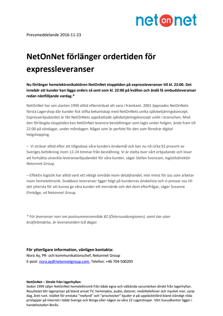Nu förlänger hemelektronikaktören NetOnNet stopptiden på expressleveranser till kl. 22:00. Det innebär att kunder kan lägga orders så sent som kl. 22:00 på kvällen och ändå få ombudsleveranser redan nästföljande vardag.*