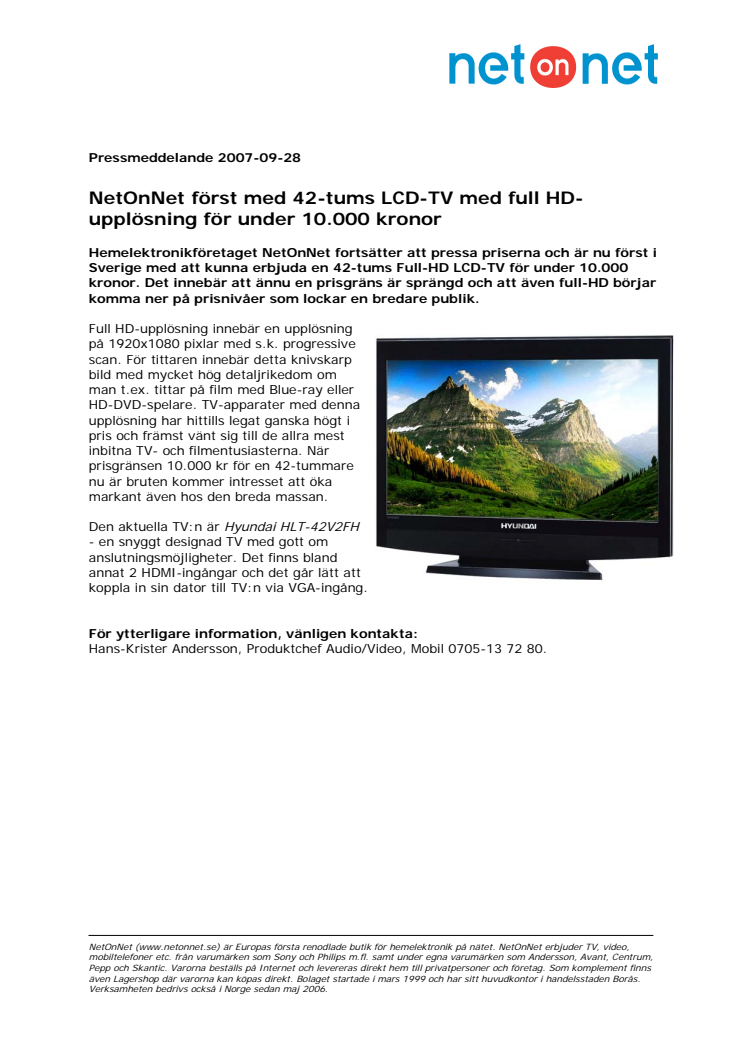 Hemelektronikföretaget NetOnNet fortsätter att pressa priserna och är nu först i Sverige med att kunna erbjuda en 42-tums Full-HD LCD-TV för under 10.000 kronor. Det innebär att ännu en prisgräns är sprängd och att även full-HD börjar komma ner på prisnivåer som lockar en bredare publik.