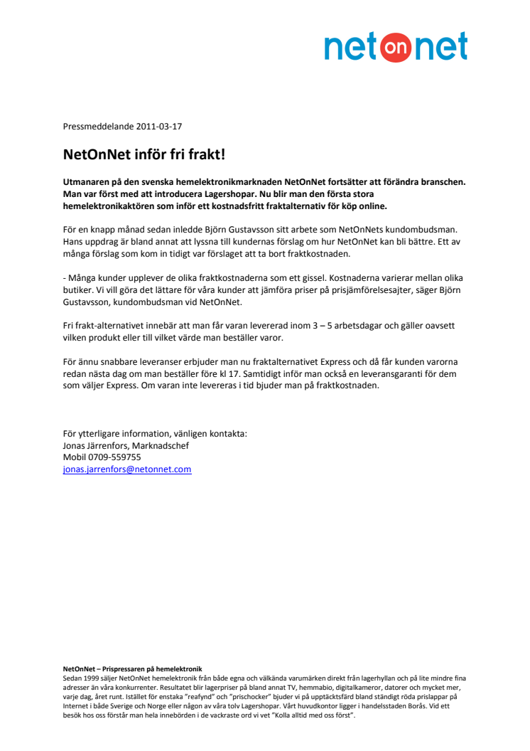 Utmanaren på den svenska hemelektronikmarknaden NetOnNet fortsätter att förändra branschen. Man var först med att introducera Lagershopar. Nu blir man den första stora hemelektronikaktören som inför ett kostnadsfritt fraktalternativ för köp online.