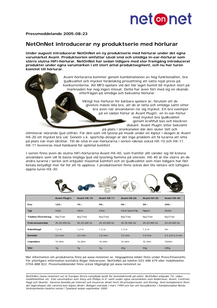 Under augusti introducerar NetOnNet en ny produktserie med hörlurar under det egna varumärket Avant. Produktserien omfattar såväl små och smidiga in-ear-hörlurar som större slutna HiFi-hörlurar. NetOnNet har sedan tidigare med stor framgång introducerat produkter under egna varumärken i ett stort antal produktsegment, och nu har turen kommit till hörlurar.