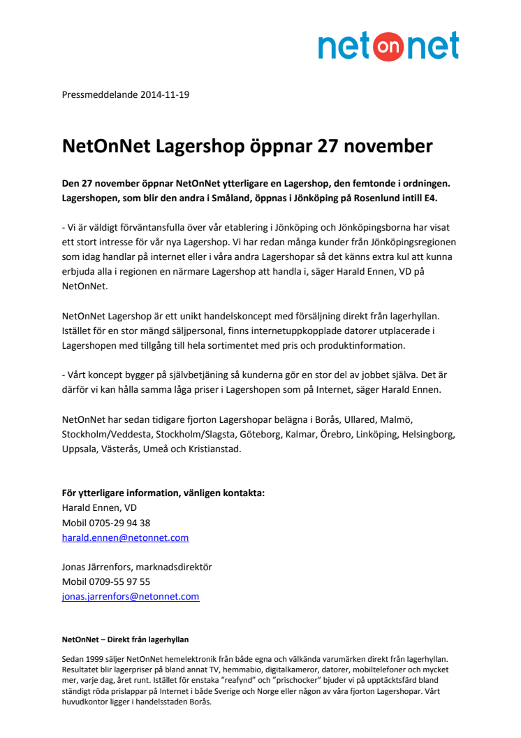 Den 27 november öppnar NetOnNet ytterligare en Lagershop, den femtonde i ordningen. Lagershopen, som blir den andra i Småland, öppnas i Jönköping på Rosenlund intill E4.