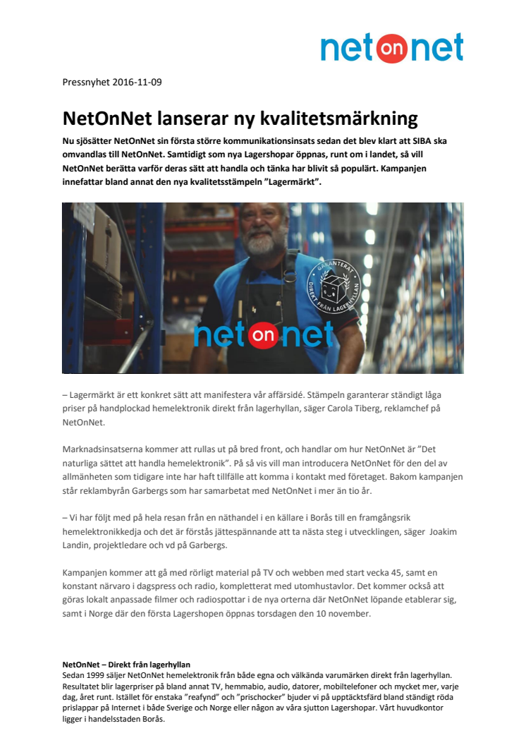 Nu sjösätter NetOnNet sin första större kommunikationsinsats sedan det blev klart att SIBA ska omvandlas till NetOnNet. Samtidigt som nya Lagershopar öppnas, runt om i landet, så vill NetOnNet berätta varför deras sätt att handla och tänka har blivit så populärt. Kampanjen innefattar bland annat den nya kvalitetsstämpeln ”Lagermärkt”.