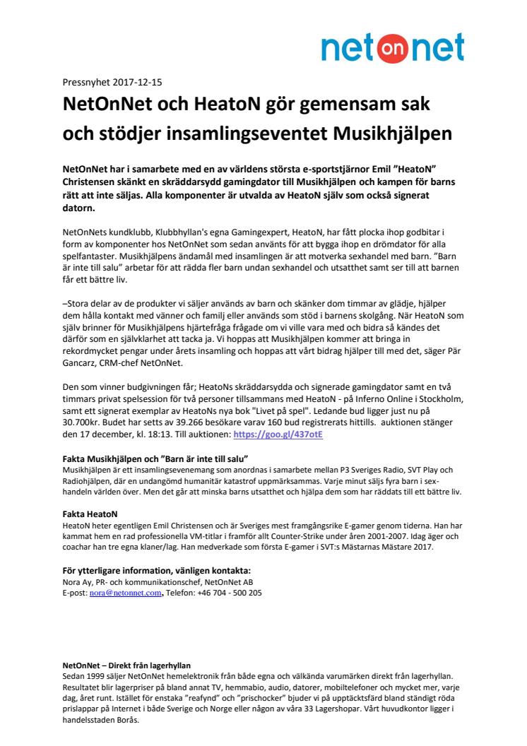 NetOnNet har i samarbete med en av världens största e-sportstjärnor Emil ”HeatoN” Christensen skänkt en skräddarsydd gamingdator till Musikhjälpen och kampen för barns rätt att inte säljas. Alla komponenter är utvalda av HeatoN själv som också signerat datorn.
