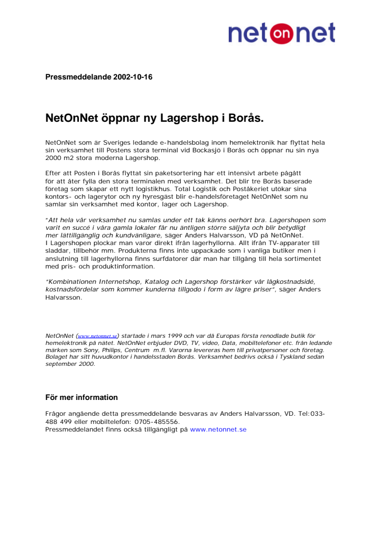 NetOnNet som är Sveriges ledande e-handelsbolag inom hemelektronik har flyttat hela sin verksamhet till Postens stora terminal vid Bockasjö i Borås och öppnar nu sin nya 2000 m2 stora moderna Lagershop.