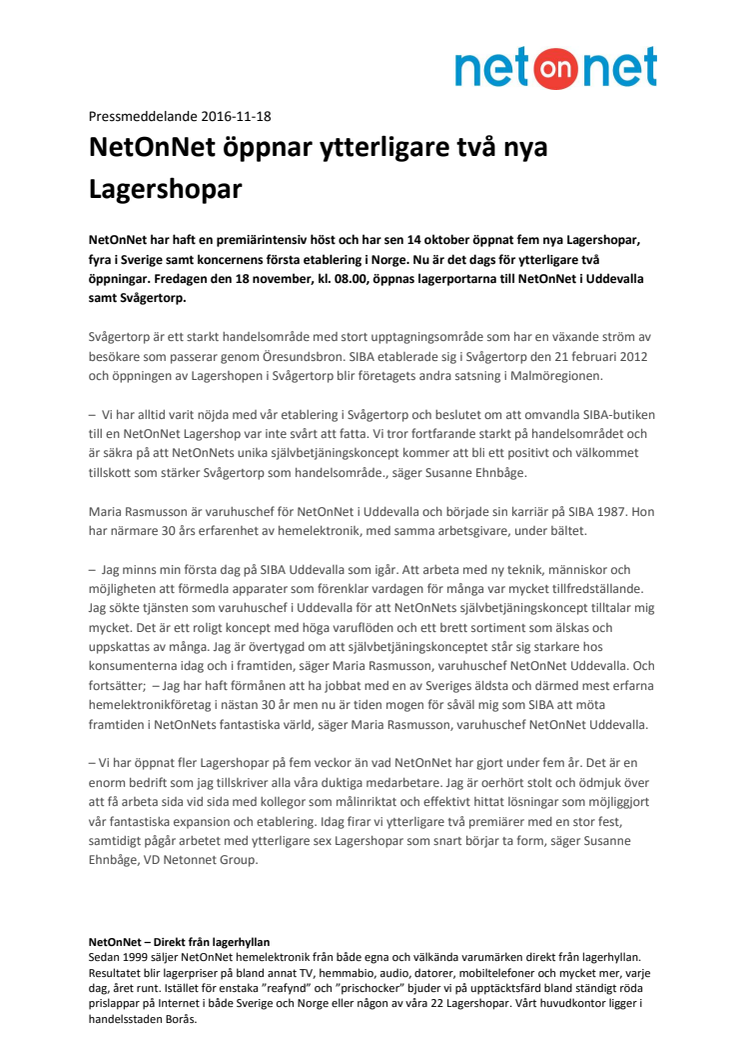 NetOnNet har haft en premiärintensiv höst och har sen 14 oktober öppnat fem nya Lagershopar, fyra i Sverige samt koncernens första etablering i Norge. Nu är det dags för ytterligare två öppningar. Fredagen den 18 november, kl. 08.00, öppnas lagerportarna till NetOnNet i Uddevalla samt Svågertorp.