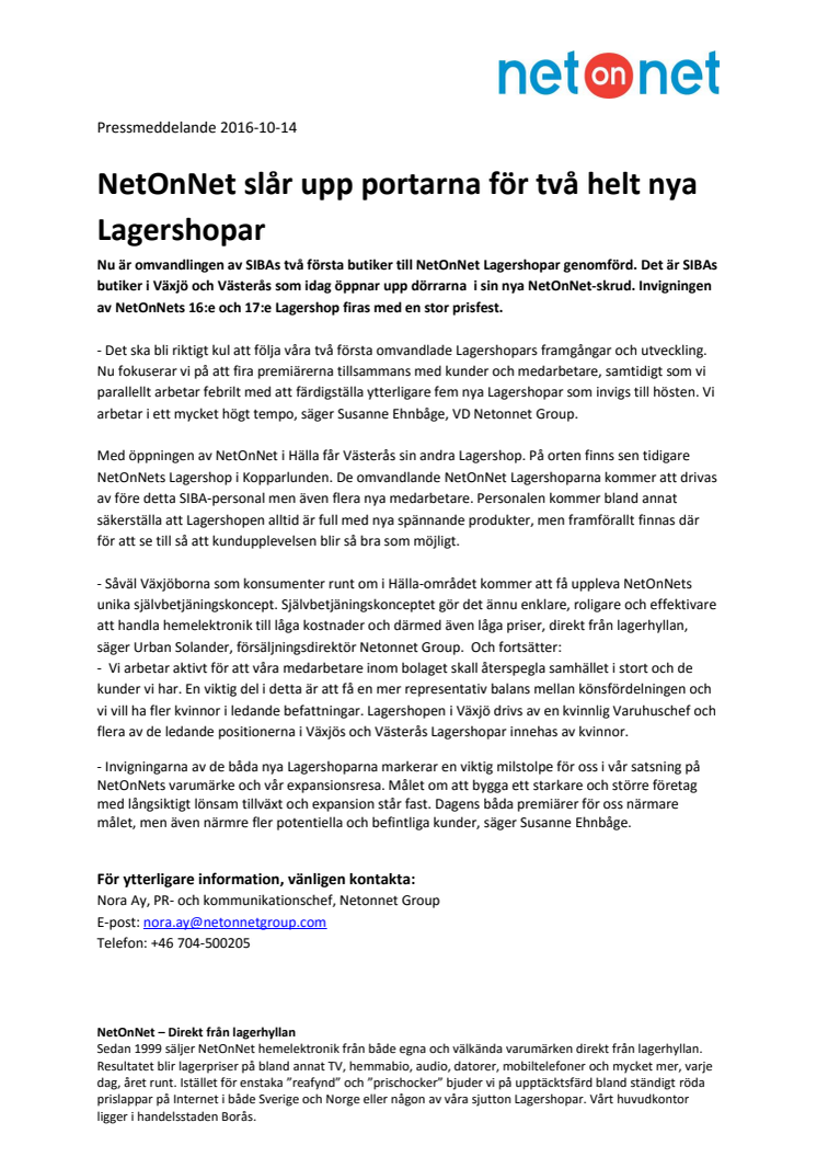 Nu är omvandlingen av SIBAs två första butiker till NetOnNet Lagershopar genomförd. Det är SIBAs butiker i Växjö och Västerås som idag öppnar upp dörrarna i sin nya NetOnNet-skrud. Invigningen av NetOnNets 16:e och 17:e Lagershop firas med en stor prisfest.