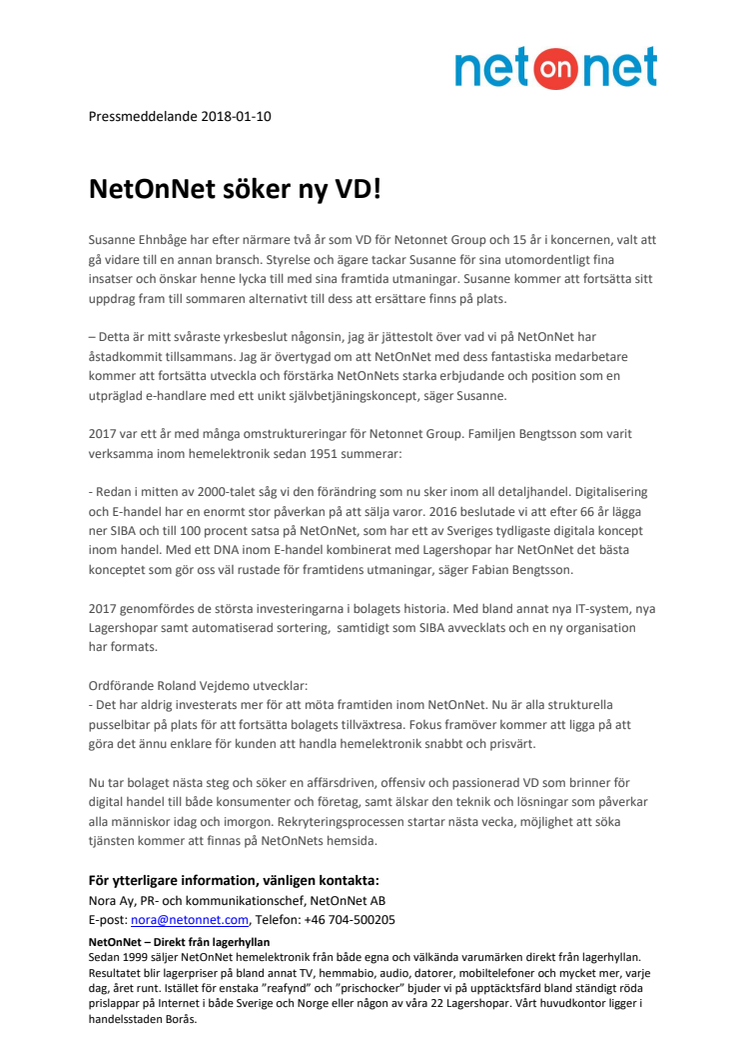 Susanne Ehnbåge har efter närmare två år som VD för Netonnet Group och 15 år i koncernen, valt att gå vidare till en annan bransch. Styrelse och ägare tackar Susanne för sina utomordentligt fina insatser och önskar henne lycka till med sina framtida utmaningar. Susanne kommer att fortsätta sitt uppdrag fram till sommaren alternativt till dess att ersättare finns på plats.