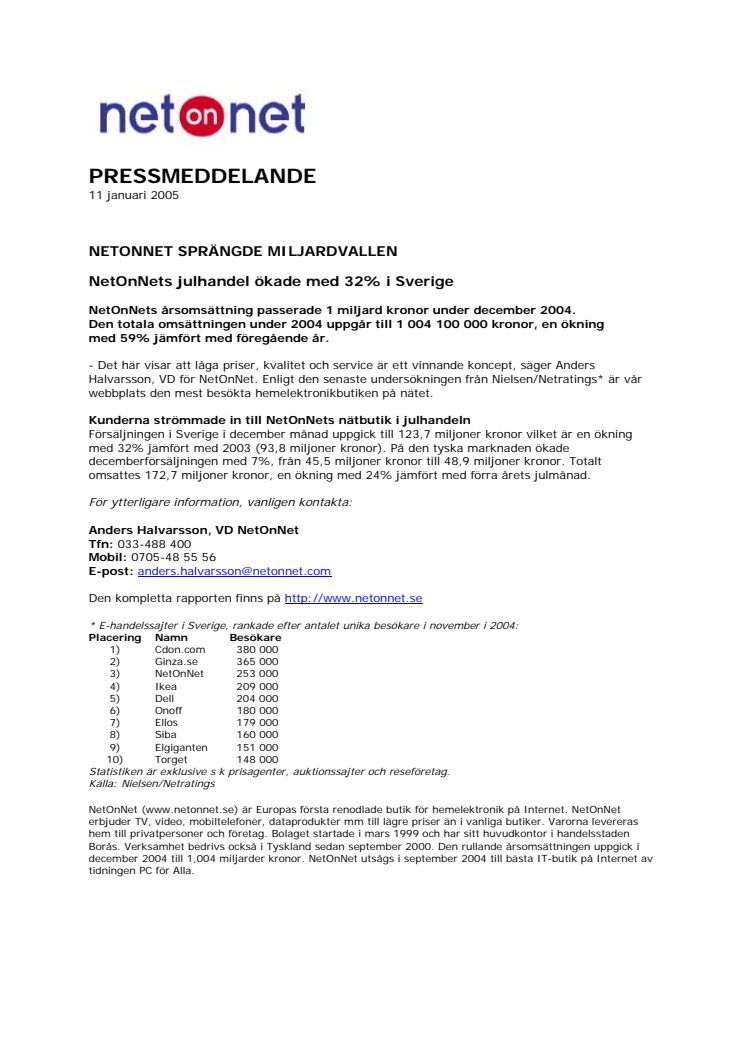 NetOnNets årsomsättning passerade 1 miljard kronor under december 2004. Den totala omsättningen under 2004 uppgår till 1 004 100 000 kronor, en ökning med 59% jämfört med föregående år.