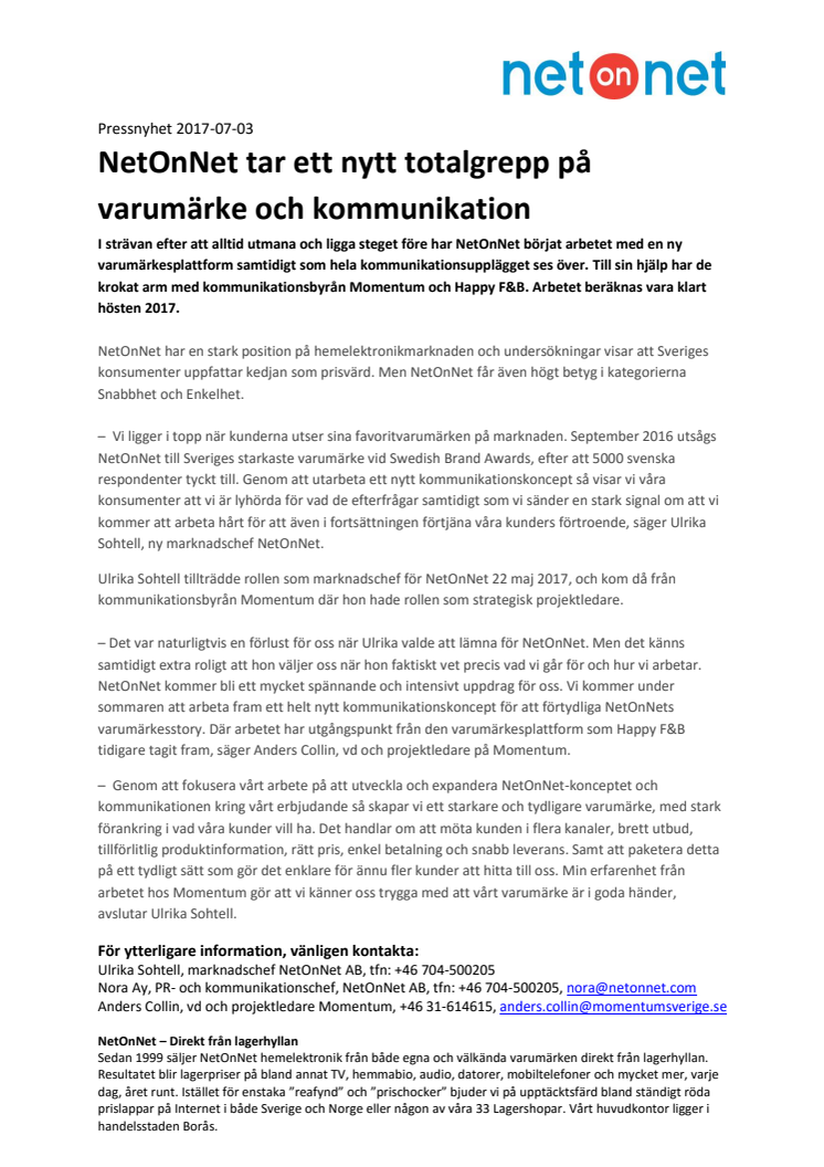 I strävan efter att alltid utmana och ligga steget före har NetOnNet börjat arbetet med en ny varumärkesplattform samtidigt som hela kommunikationsupplägget ses över. Till sin hjälp har de krokat arm med kommunikationsbyrån Momentum och Happy F&B. Arbetet beräknas vara klart hösten 2017.