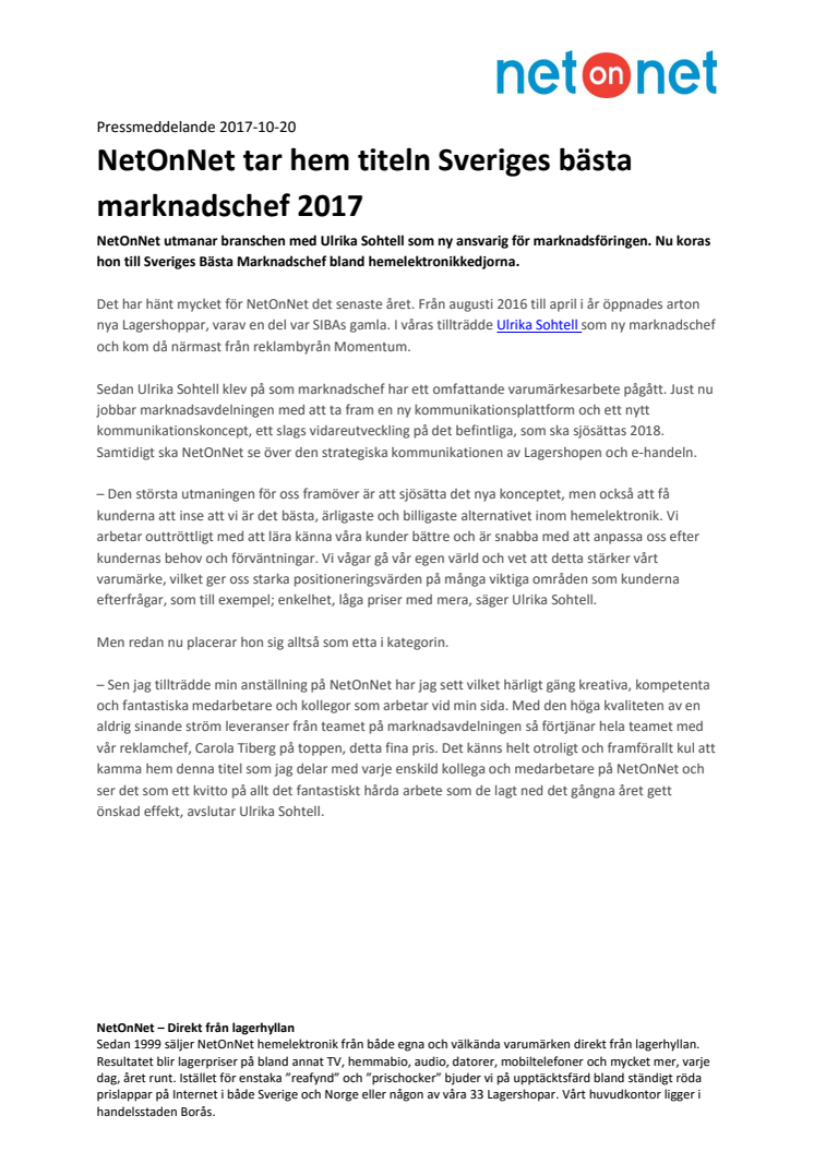 NetOnNet tar hem titeln Sveriges Bästa Marknadschef 2017