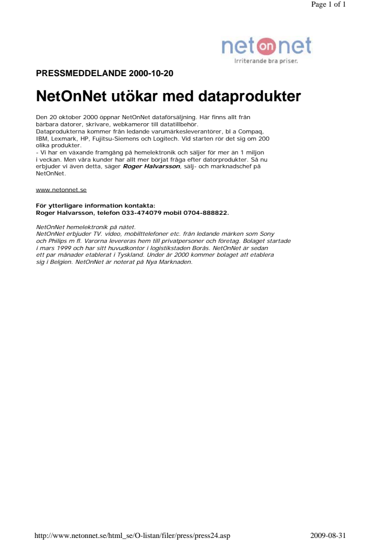 Den 20 oktober 2000 öppnar NetOnNet dataförsäljning. Här finns allt från bärbara datorer, skrivare, webkameror till datatillbehör. Dataprodukterna kommer från ledande varumärkesleverantörer, bl a Compaq, IBM, Lexmark, HP, Fujitsu-Siemens och Logitech. Vid starten rör det sig om 200 olika produkter.