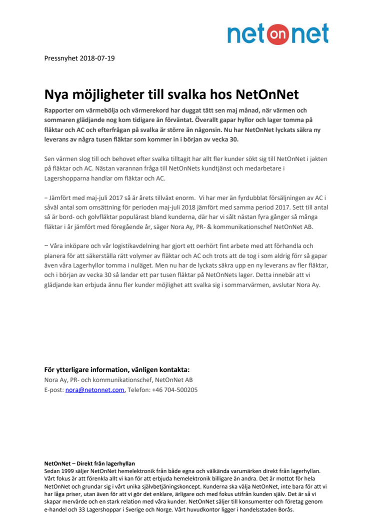 Rapporter om värmebölja och värmerekord har duggat tätt sen maj månad, när värmen och sommaren glädjande nog kom tidigare än förväntat. Överallt gapar hyllor och lager tomma på fläktar och AC och efterfrågan på svalka är större än någonsin. Nu har NetOnNet lyckats säkra ny leverans av några tusen fläktar som kommer in i början av vecka 30.