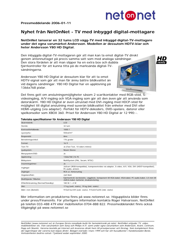NetOnNet lanserar en 32 tums LCD vägg-TV med inbyggd digital-TV-mottagare under det egna varumärket Andersson. Modellen är dessutom HDTV-klar och heter Andersson Y80 HD Digital.