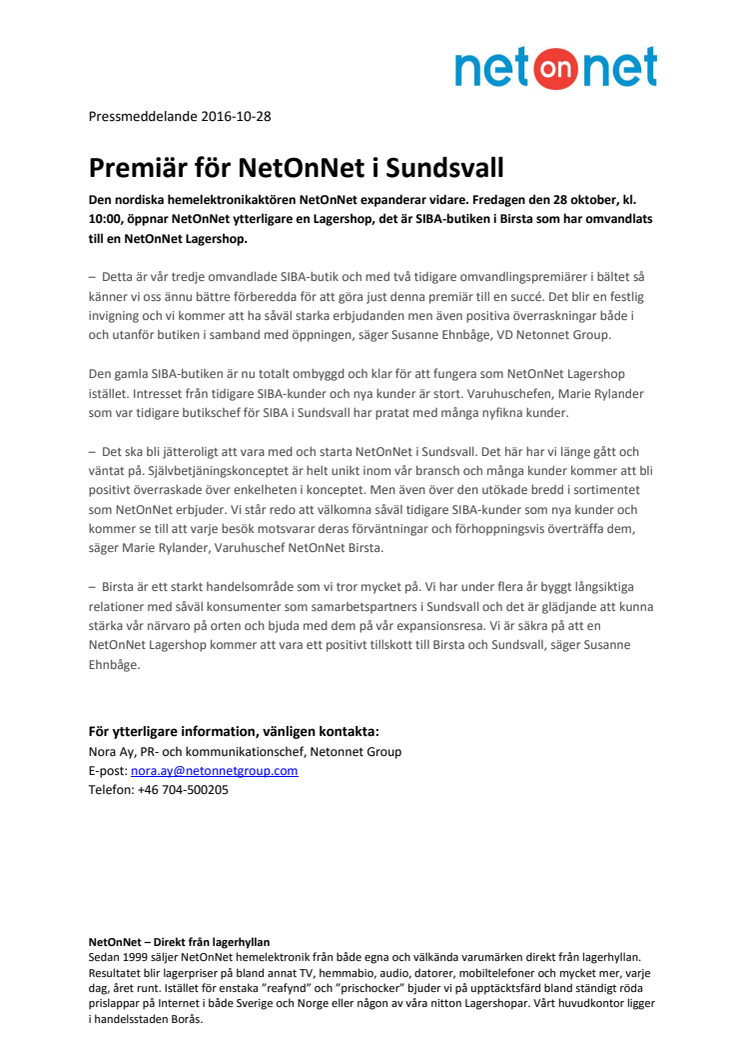 Den nordiska hemelektronikaktören NetOnNet expanderar vidare. Fredagen den 28 oktober, kl. 10:00, öppnar NetOnNet ytterligare en Lagershop, det är SIBA-butiken i Birsta som har omvandlats till en NetOnNet Lagershop.