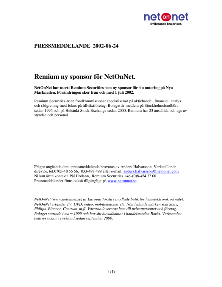 NetOnNet har utsett Remium Securities som ny sponsor för sin notering på Nya Marknaden. Förändringen sker från och med 1 juli 2002.