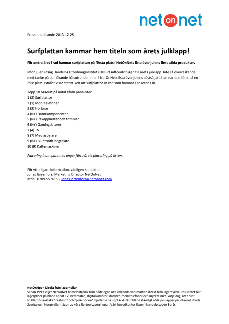 För andra året i rad hamnar surfplattan på första plats i NetOnNets lista över julens flest sålda produkter.