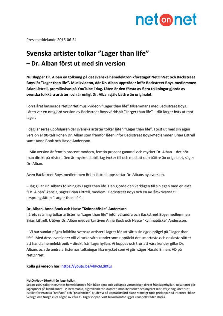 Nu släpper Dr. Alban en tolkning på det svenska hemelektronikföretaget NetOnNet och Backstreet Boys låt ”Lager than life”. Musikvideon, där Dr. Alban uppträder inför Backstreet Boys-medlemmen Brian Littrell, premiärvisas på YouTube i dag. Låten är den första av flera tolkningar gjorda av svenska folkkära artister, och är enligt Dr. Alban själv bättre än originalet.
